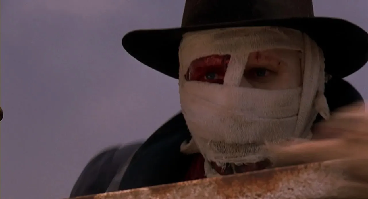 Cast: Liam Neeson as Peyton Westlake / Darkman, Frances McDormand as Julie Hastings, Colin Friels as Louis Strack Jr., Larry Drake as Robert G. Durant, Nelson Mashita as Yakitito, Jessie Lawrence Ferguson as Eddie Black, Rafael H. Robledo as Rudy Guzman, Dan Hicks as Skip, Ted Raimi as Rick, Dan Bell as Smiley, Nicholas Worth as Pauly, Aaron Lustig as Martin Katz, Arsenio "Sonny" Trinidad as Hung Fat, Said Faraj as Convenience Store Clerk, Nathan Jung as Chinese Warrior, Professor Toru Tanaka as Chinese Warrior #2, John Lisbon Wood as Carnival Booth Attendant, Frank Noon as Side Show Barker, William Dear as Limo Driver, Julius Harris as Gravedigger, Bridget Hoffman as Computer (Voice), Philip A. Gillis as Priest, Maggie Moore as Nurse, Carl Bresk as Policeman #1, Sean Daniel as Policeman #2, John Landis as Physician, Carrie Hall as Screaming Woman, John Cameron as Bartender, Craig Hosking as Helicopter Pilot, Karl A. Wickman as Police Helicopter Pilot, Cliff Fleming as Police Helicopter Pilot, Andy Bale as Dockworker #1, Neal McDonough as Dockworker #2, Stuart Cornfeld as Dockworker #3, William Lustig as Dockworker, Scott Spiegel as Dockworker, Cary Tyler as Dockworker #6, Charles W. Young as Dockworker with Bullet in Forehead, Bruce Campbell as Final Shemp, Jenny Agutter as Burn Doctor (uncredited), Ethan Coen as Oldsmobile Passenger (uncredited), Joel Coen as Oldsmobile Driver (uncredited), Tau Logo as Chinese Warrior #3 (uncredited), Josh Becker as Carnival Goer (uncredited), Jorga Caye as Parking Lot (uncredited), Christopher Doyle as Goon at Construction Site (uncredited), Troy Fromin as Durant's Henchman (uncredited), Tony Gardner as Burn Ward Nurse / Lizard Man (uncredited)